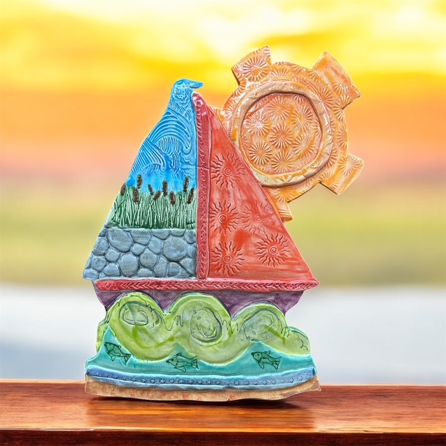 This fun ceramic wall sailboat is alive with texture and punchy color. It is made to hang with built in hangers on the back. Free shipping in the continental US. Contact us for shipping to Hawaii or Alaska. About 12×12